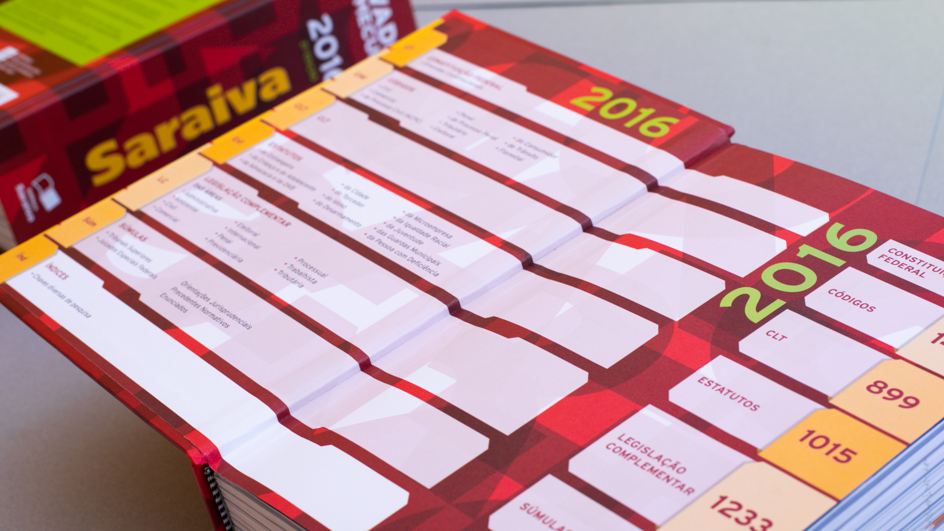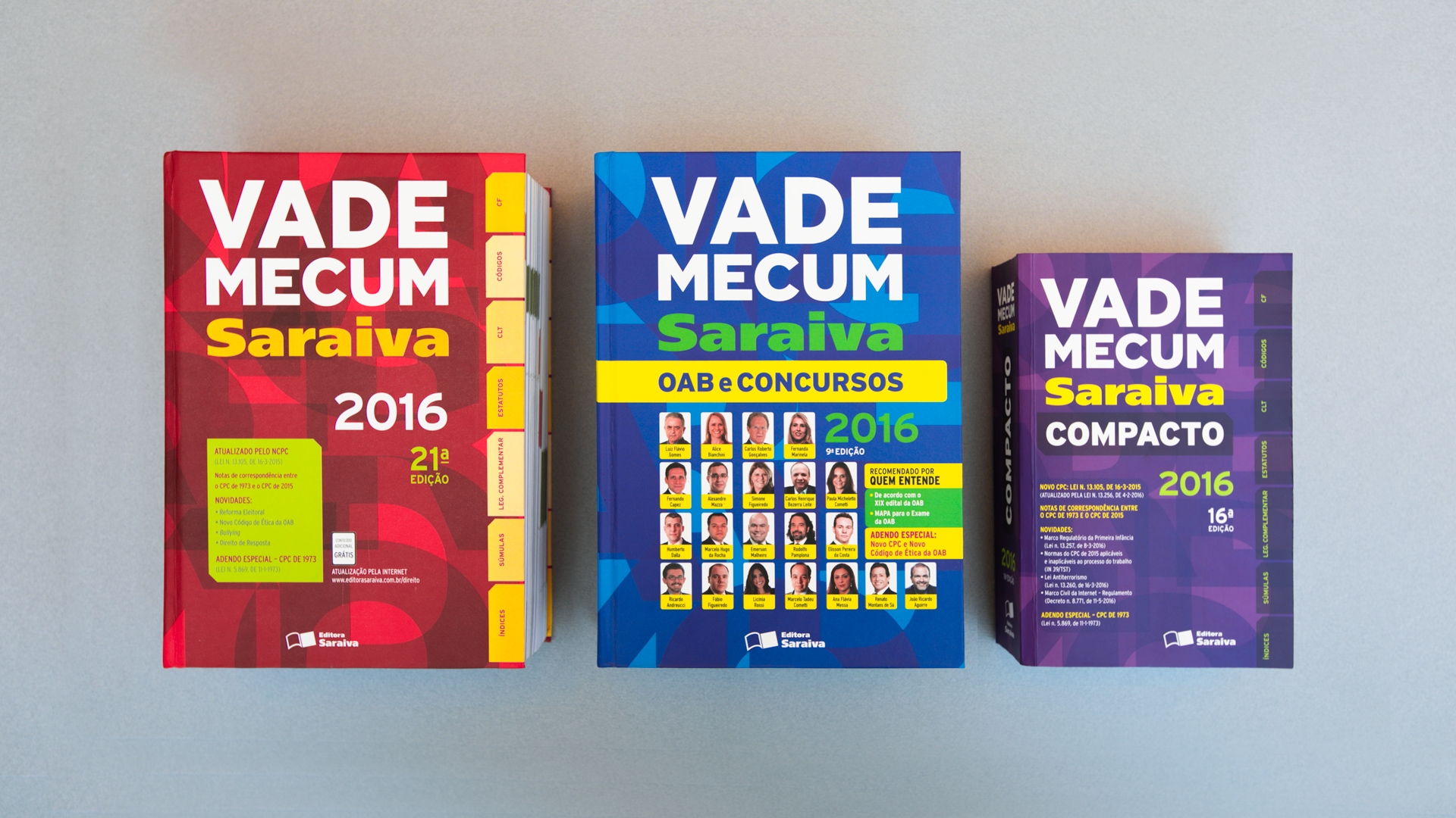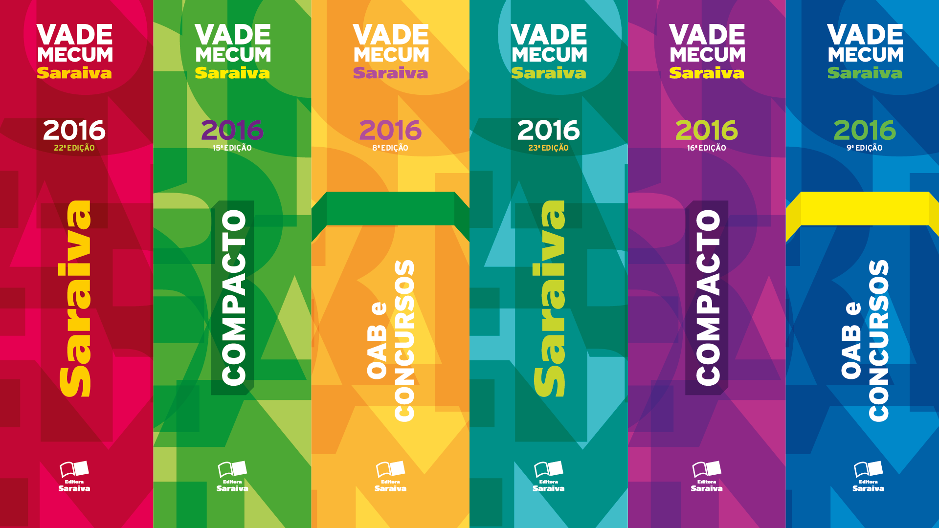 A Saraiva, no primeiro semestre de cada ano, lança uma das principais obras do selo jurídico: a Coleção Vade Mecum, composta por três volumes (Vade Mecum, Vade Mecum Compacto e OAB e Concursos). No segundo semestre, é feita apenas a revisão das leis para atualização e republicação. O briefing para o projeto gráfico das capas pedia uma nova proposta: criar uma ruptura dos últimos projetos executados. O leitor precisava ter clareza sobre o conjunto de publicações para o ano, além de diferenciá-lo visualmente das edições anteriores. O conceito “alltype”, composto por tipografia forte e contemporânea, serviu na desconstrução da linguagem verbal, explorado também como elemento de textura de fundo. Tudo associado à escolha cromática viva para alternância das edições entre volumes e semestres.