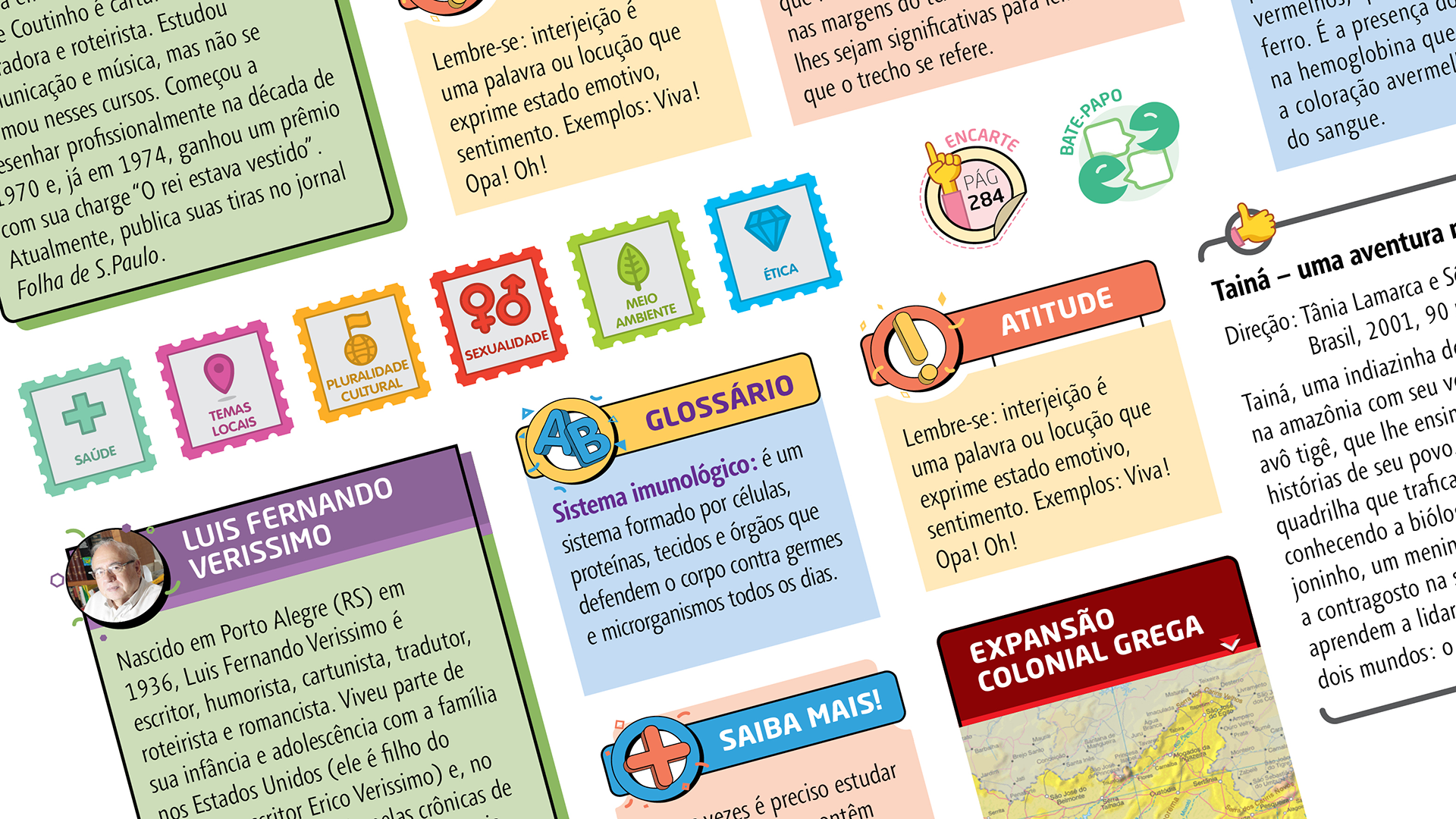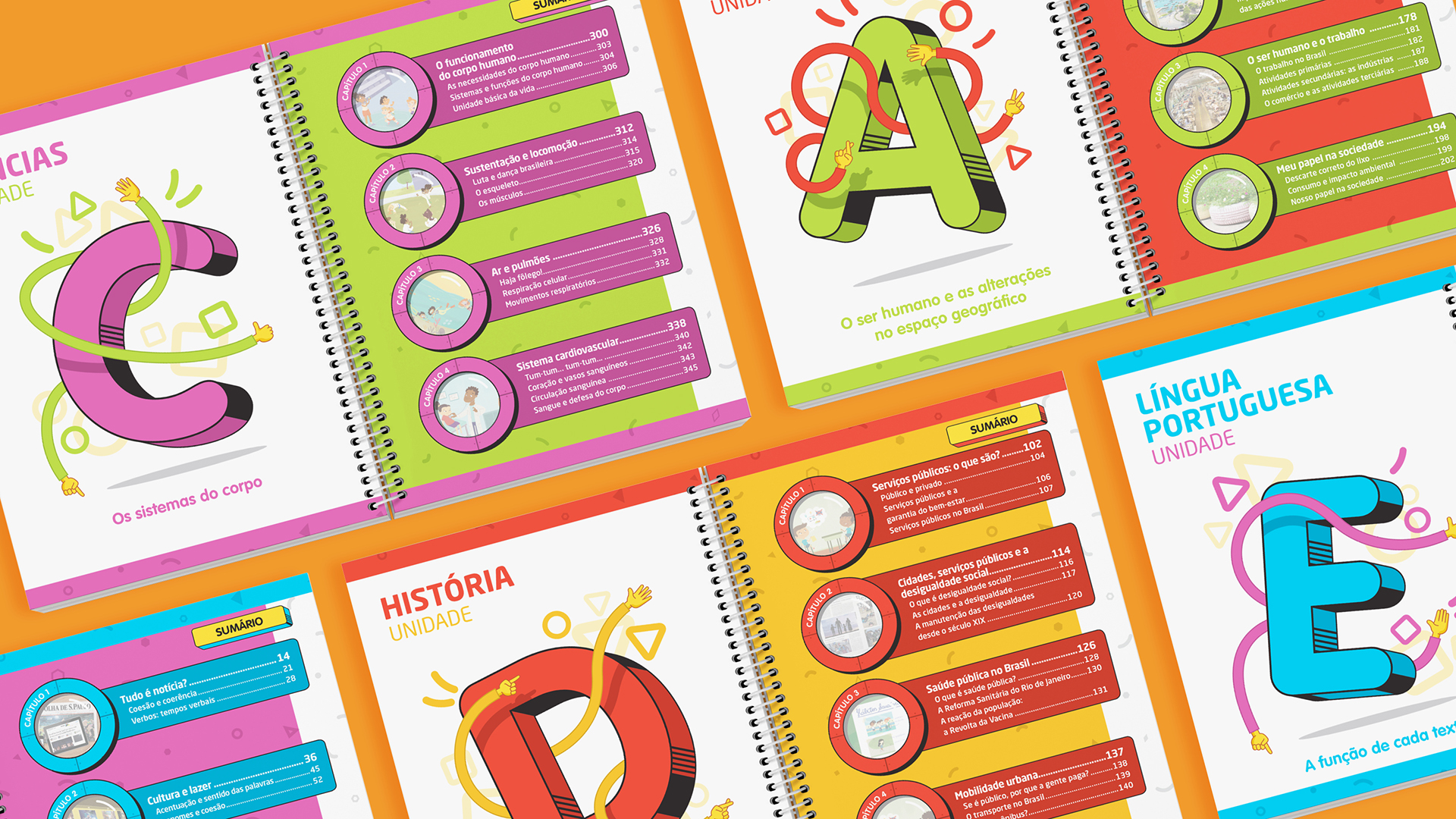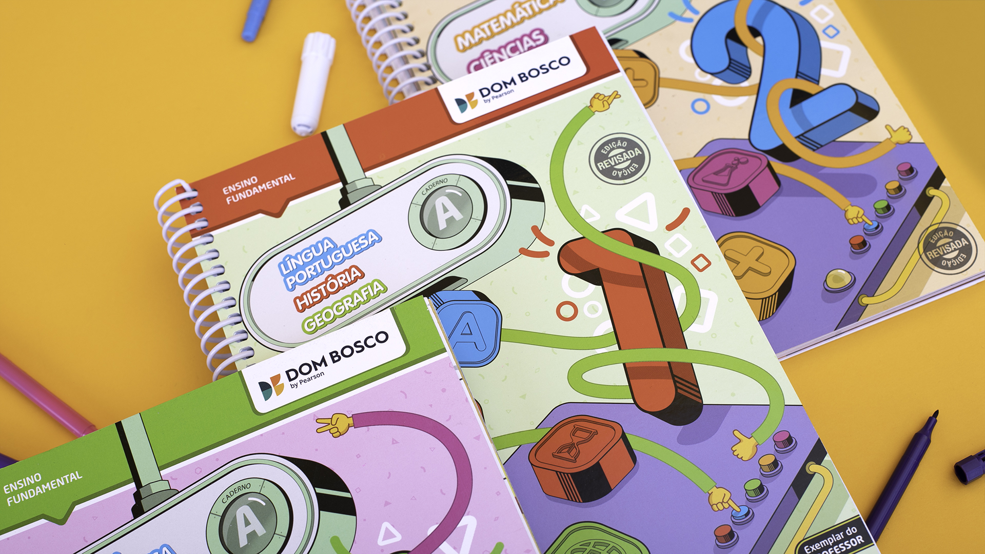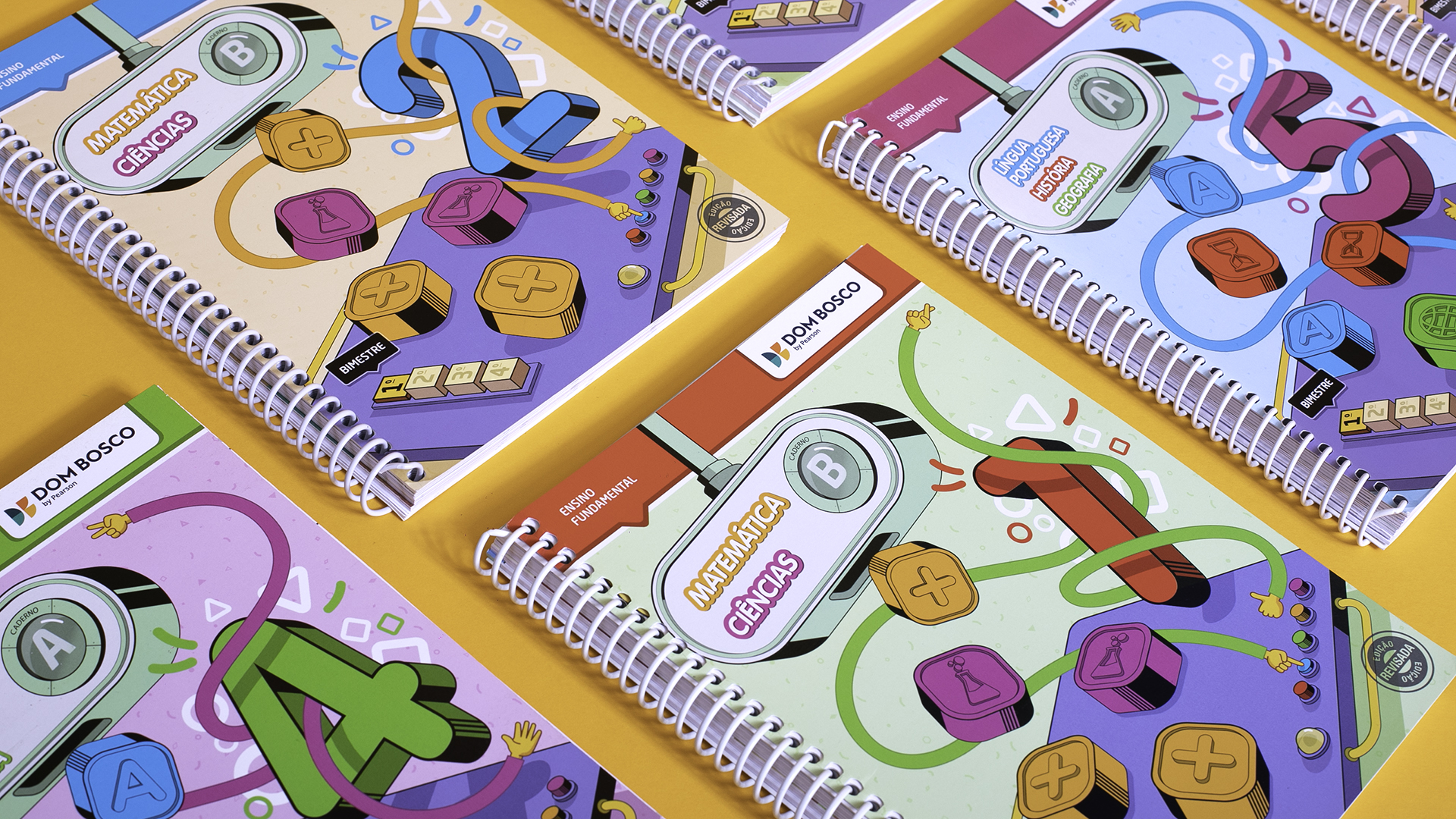 Com mais de 50 anos, o Dom Bosco é um dos principais sistemas de ensino do Brasil. A coleção Ensino Fundamental Anos Iniciais é um material didático colorido e lúdico voltado para alunos de 5 a 11 anos de idade, fracionados por apostilas bimestrais.O novo projeto gráfico teve como compromisso organizar o conteúdo pedagógico de forma atrativa, deixando a navegação clara e objetiva ao longo dos livros para que os alunos identificassem a estrutura editorial e absorvessem de forma natural e intuitiva cada disciplina, capítulo, seção, boxe, atividade, encarte etc. Além desses elementos visuais lúdicos, fizemos uma escolha cuidadosa da tipografia para reforçar a preocupação com a boa leitura, principalmente, nesse início de letramento e alfabetização na vida do aluno.