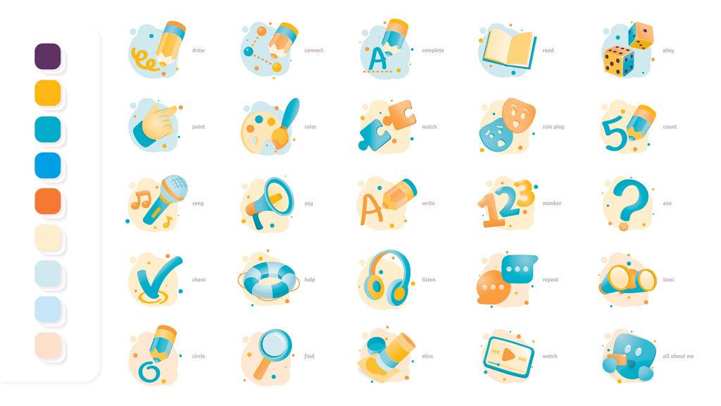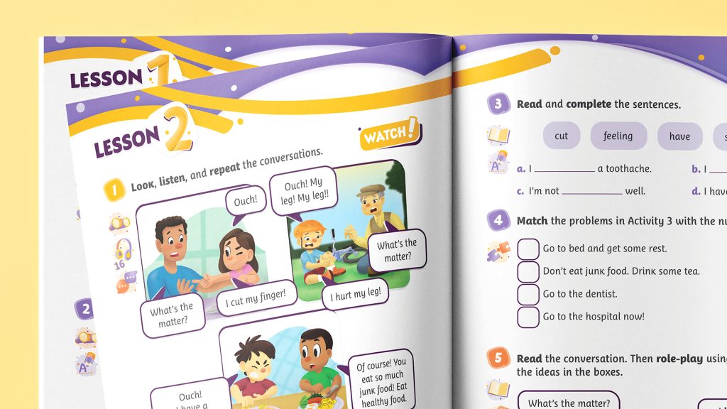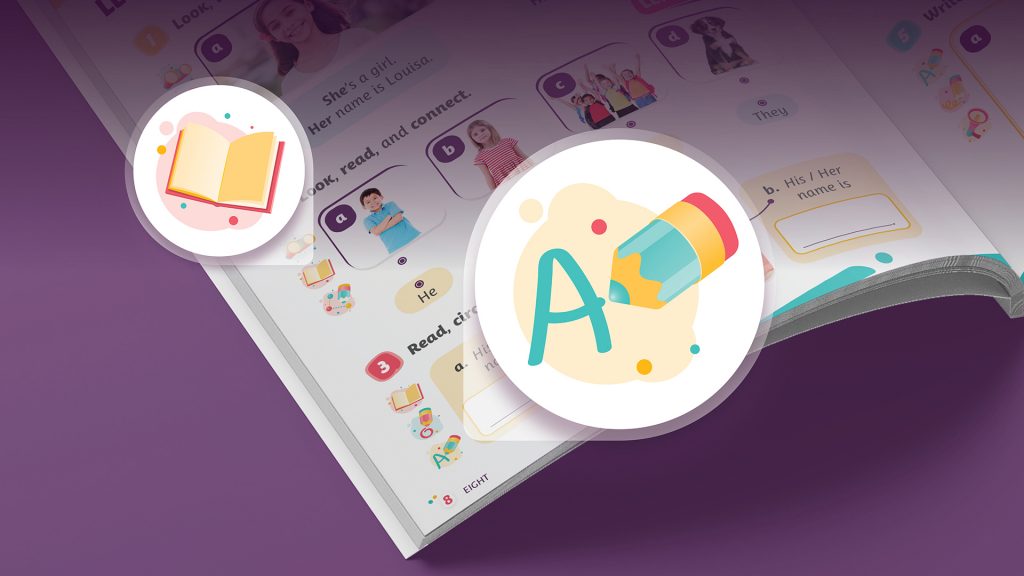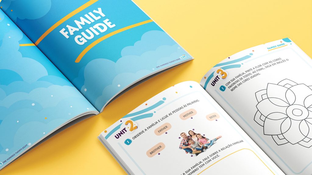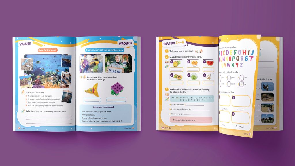 Desenvolvemos um projeto completo, com marca, capa e miolo do livro, além de um belo conjunto de pictogramas. O resultado é um visual dinâmico e envolvente, que potencializa a conquista do resultado de aprendizagem de um idioma adicional.